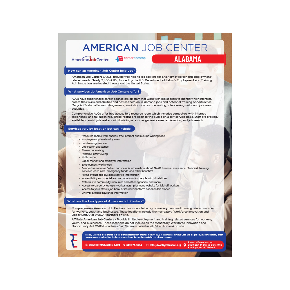 This publication contains a complete list of both comprehensive and affiliate American Job Centers (AJCs) within Alabama. AJCs provide free help to job seekers for a variety of career and employment related needs. Nearly 2,400 AJCs, funded by the U.S. Department of Labor's Employment and Training Administration, are located throughout the United States.
